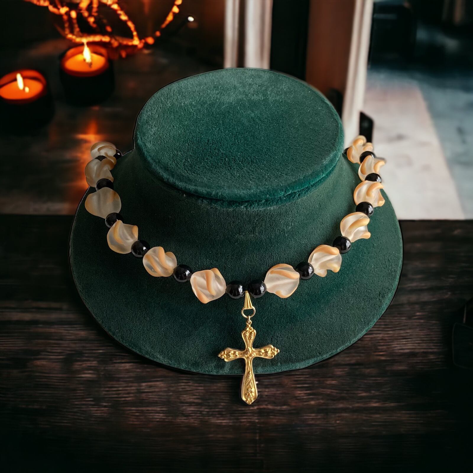 十字架とガラスビーズネックレス(ヴィンテージ)。日本のヴィンテージガラスビーズを使用し、薔薇の花ビラのような美しい形のビーズがアクセントとなります。