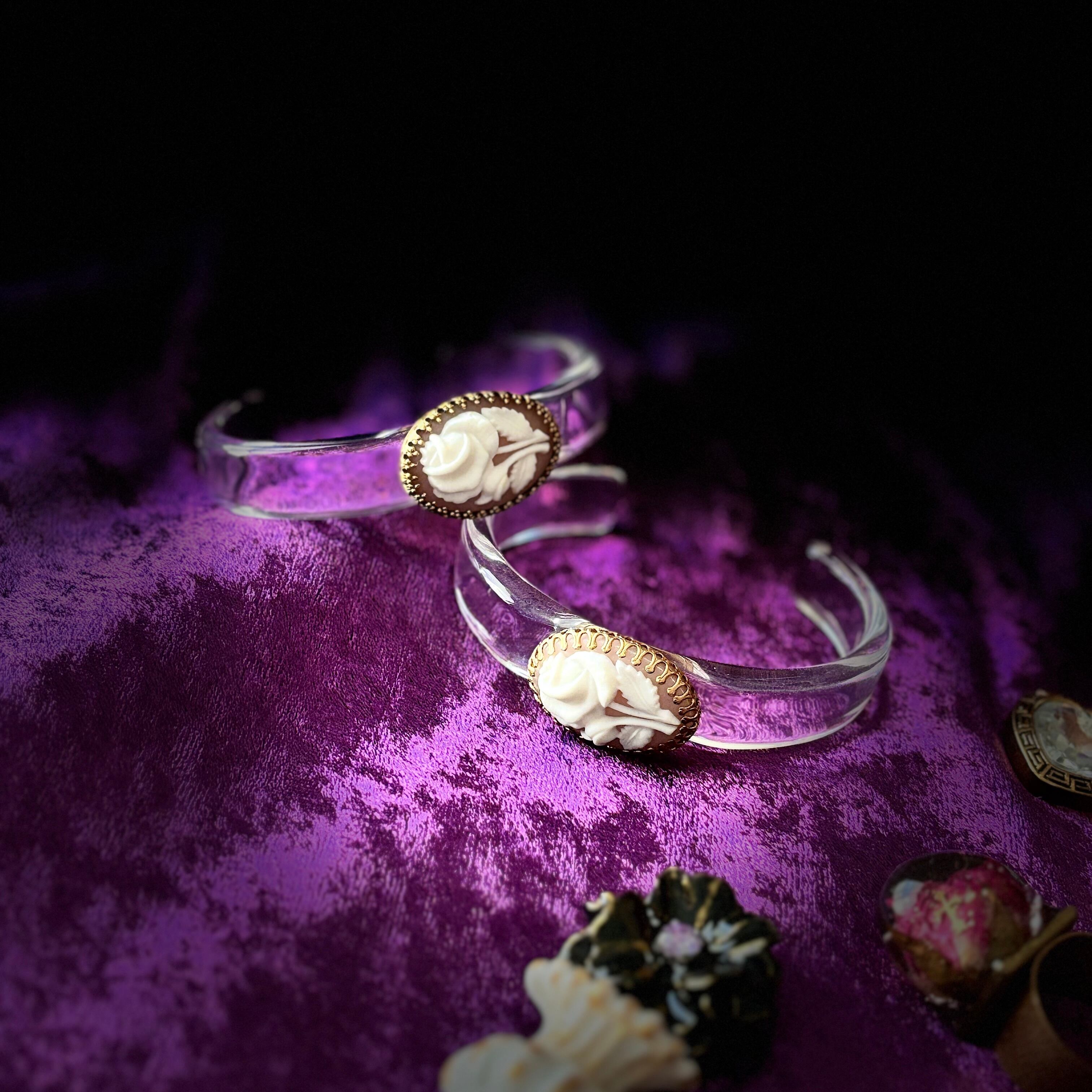 透明アームにヴィンテージ真鍮とピンクの花のカメオが一粒ついた、シンプルかつ上品なバングルです。